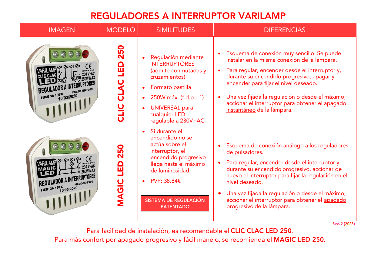 En la tabla superior se muestran las diferencias entre los dos reguladores UNIVERSALES Varilamp en formato pastilla que funcionan con los mismos interruptores de cualquier vivienda, por lo que no será necesario sustituirlos para disfrutar de la regulación lumínica.
