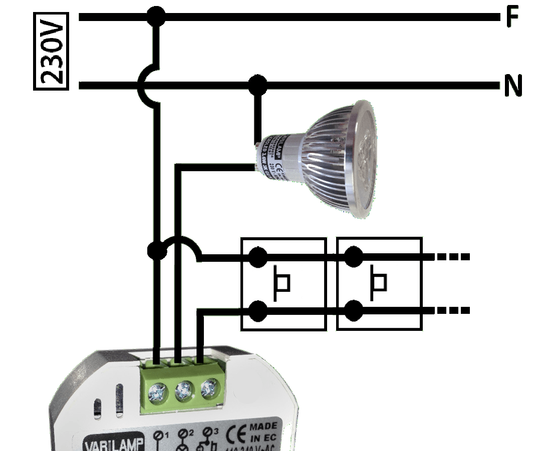 Admite desde 5W hasta un máximo de 300W de carga máxima para LED regulables a FINAL DE FASE, halógenos e incandescencia.
