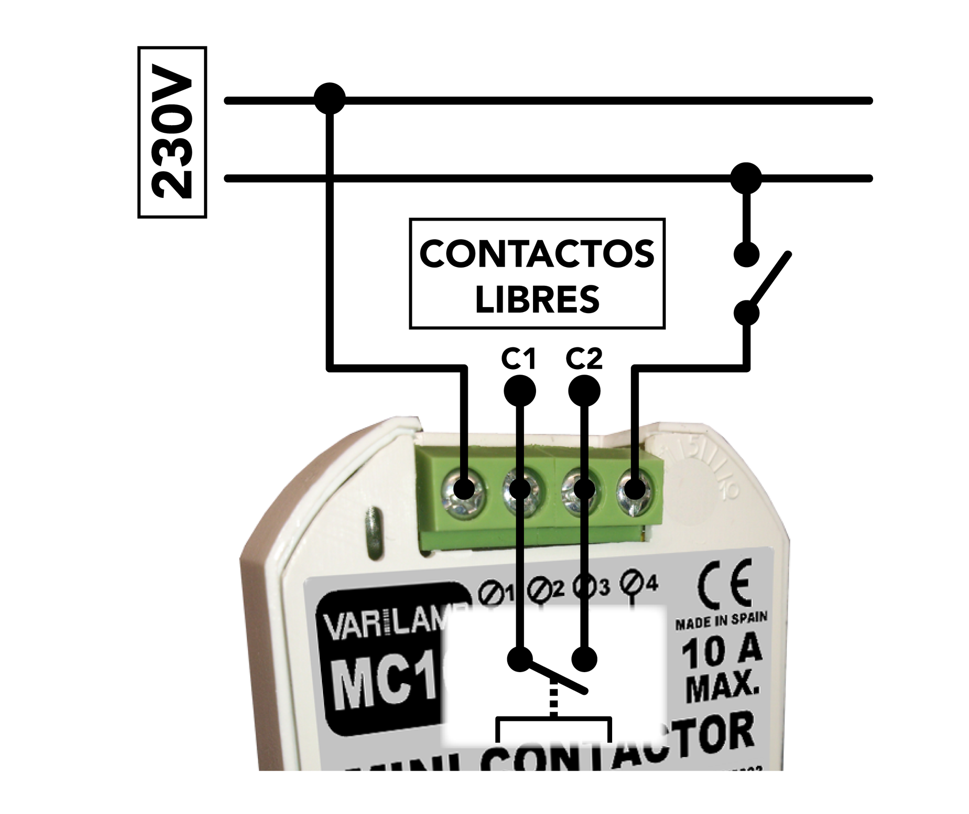 Instalación sencilla a 4 hilos. Conectar alimentación a 230VAC tras interruptor o pulsador a las bornas 1 y 4 sin importar la polaridad. En las bornas 2 y 3 se tienen los contactos libres de tensión normalmente abiertos, para utilizarlos según conveniencia del instalador. Al alimentar el minicontactor, se cierran C1 y C2, y al apagar, se abren.