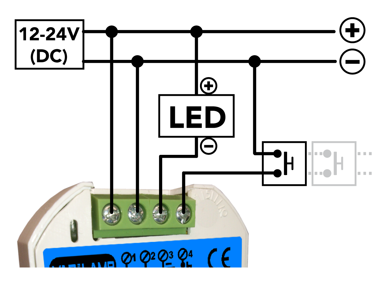 Instalación a 4 hilos. Conectar Positivo de la fuente a borna 1 y Negativo de la fuente a borna 2. En borna 3 conectar el negativo de la tira o lámpara LED y el positivo del LED directamente al positivo de la fuente. Finalmente en borna 4 conectar uno de los polos del pulsador/es, cuyo polo contrario viene del negativo de la fuente.