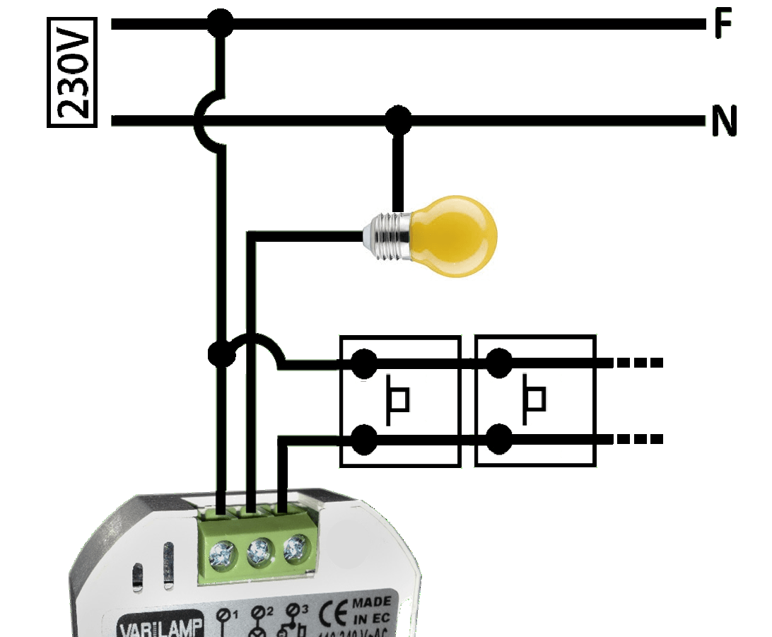 Instalación a 3 hilos. Conectar Fase a borna 1. En borna 2 conectar la vuelta de carga, que viene de Neutro. Finalmente en borna 3 conectar la vuelta de pulsador/es que viene de Fase. Se pueden conectar hasta 5 pulsadores en paralelo con indicador luminoso e ilimitados sin él.