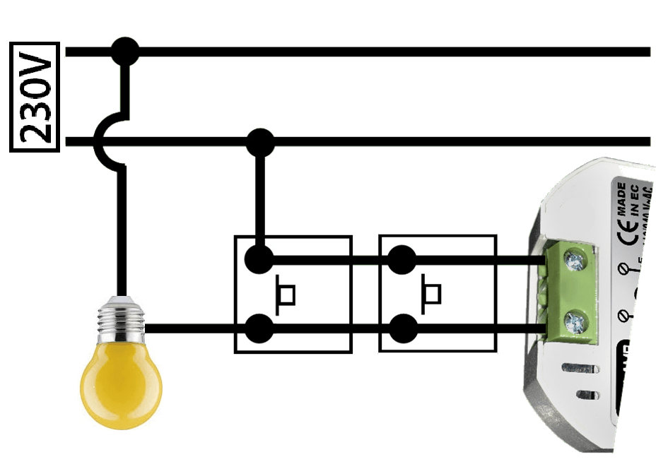 Instalación sencilla a 2 hilos. Conectar en paralelo al pulsador/es sin importar la polaridad, como si fuese otro pulsador más.